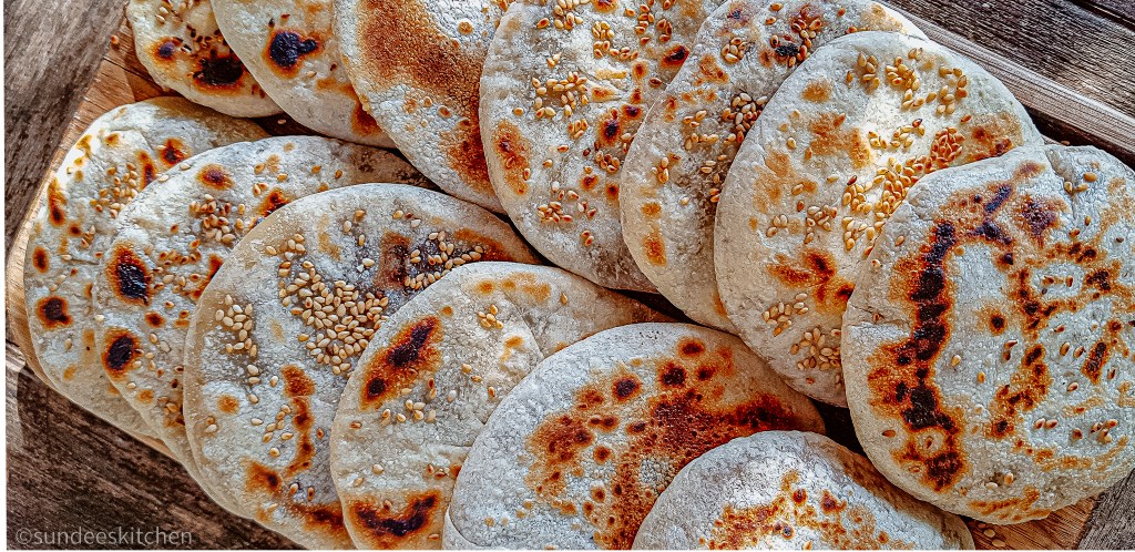 On a plate, prepare about 1/2 cup of sesame seeds. You can add more if you like. Press the flatten bread onto the sesame seeds or sprinkle on top and roll it again.