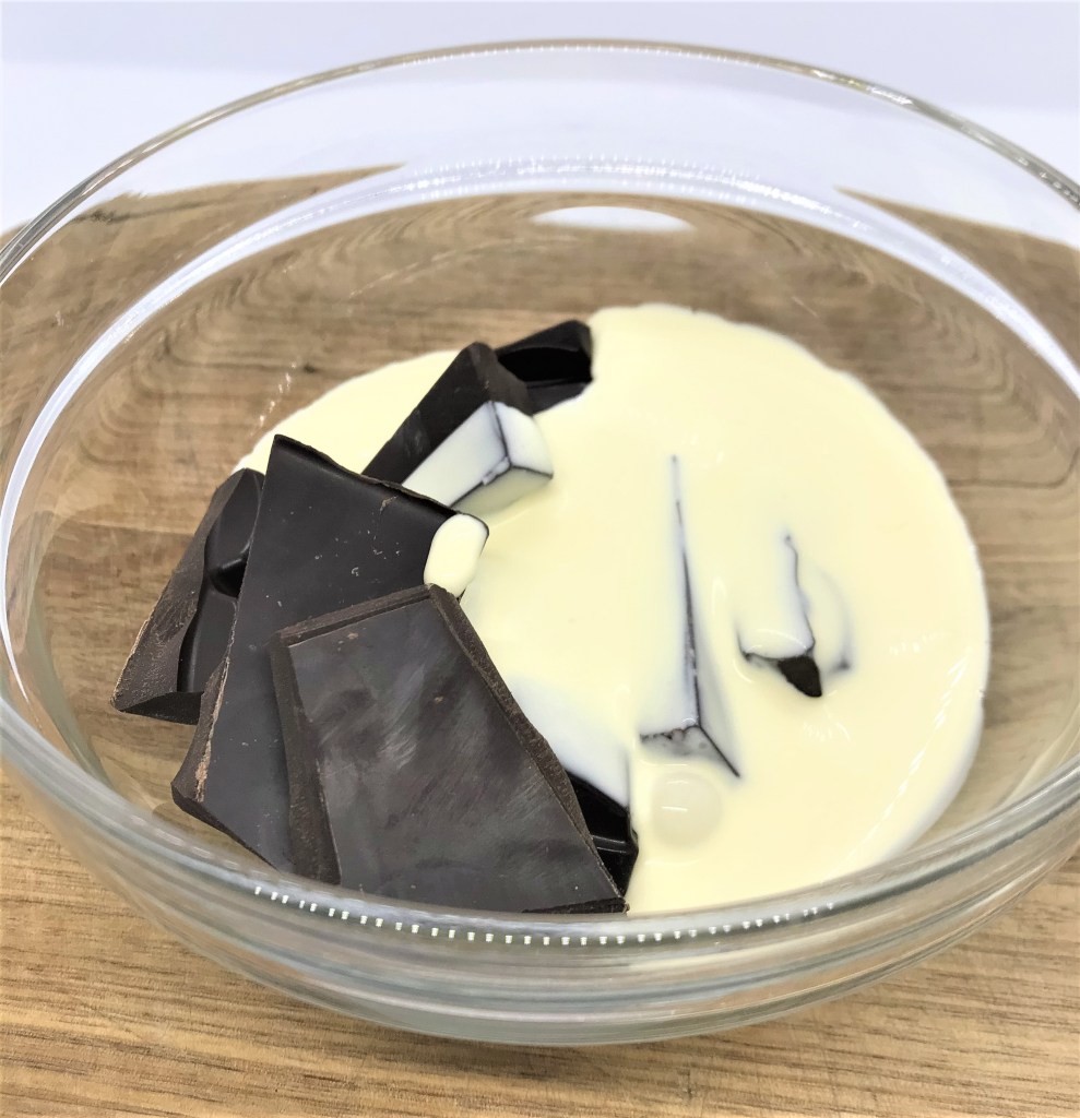 3. Making the Chocolate Fudge Sauce, combine the dark chocolate bars or chips in a microwavable container then add the thickened cream. Heat for 1minute, stir every 30seconds until dissolved.