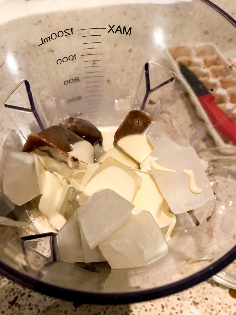 4. When the coffee mixture is frozen, remove from the ice cube tray and place it in a blender. Add the ice cubes, cream and remaining milk, then blend until smooth.