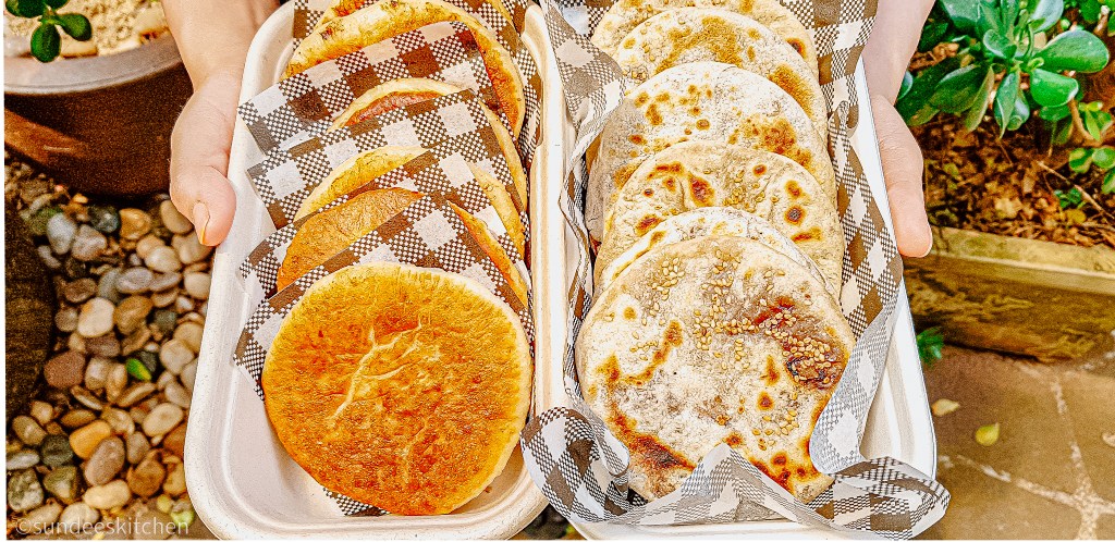 What is Piaya? It is a muscovado-filled unleavened flat bread from the Philippines especially common in Negros Occidental in the Visayas region where it is a popular delicacy. It is made by filling dough with a mixture of muscovado and glucose syrup. (We didn’t use the syrup for this recipe) The filled dough is then flattened with a rolling pin, sprinkled with sesame seeds and baked on a griddle. The traditional sweet filling made of muscovado has other alternatives, including ube and mango. (Wikipedia) The Visayas region is the main producer of muscovado sugar (unrefined cane sugar).